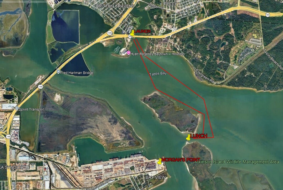 Hazards: This is a 6 - 8 mile Level 2 trip. Remember to dress for immersion. Water temperature will be about 68. Tabbs Bay has very little boat trraffic. Oil wells, power poles, and debris keep powerboat traffic under control. There are submerged pilings and debris around the Causeway and in the Bay. I have never hit anything here, but be wary if you have new gelcoat. There could be mosquitos, rattlesnakes, bears and tarantulas on the islands. Ship wakes may curl onto the beach at our lunch spot, so leave nothing near the water. The busy ramp is near some shabby looking apartments; be aware and don't leave valuables in your vehicle.